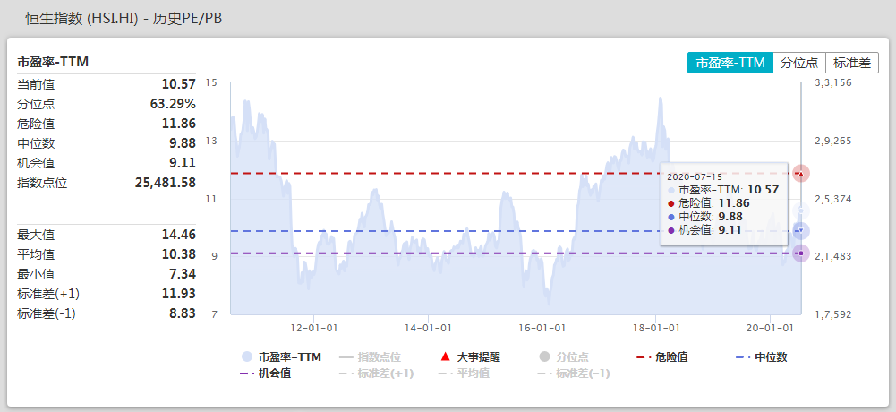 根据恒生指数历史市盈率来看,截至7月15日收市,恒生指数动态市盈率为10.57,超过了中位数9.88,但是离危险值11.86还有一段距离。
