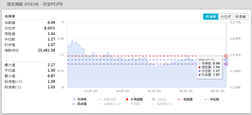 而来看恒指的市净率,截止7月15日收市仍处于0.99的水平,这低于历史中位数1.27不少,说明恒指仍然处于跌破净资产的状态。