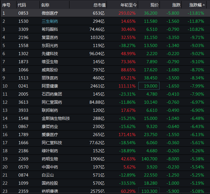 我们首先来看看7月16日下跌幅度领先的恒生医疗保健行业个股。