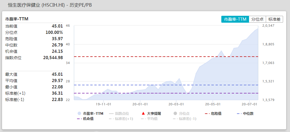 而如果我们观察恒生医疗保健业的动态市盈率水平,会发现一个现象。截至7月15日收市,恒生医疗保健业的动态市盈率为45.01,创下2019年9月以来新高水平,高于历史中位数的26.79,也高于危险值的35.97。