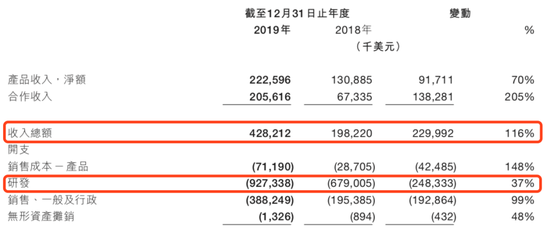 2016-2018年,百济神州亏损净额分别为1.2亿美元、0.93亿美元、6.7亿美元,2019年,收入总额为4.28亿美元,亏损净额9.5亿美元。不难看出,亏损数额有增长的趋势,且四年时间合计净亏损约18亿美元。这被外界质疑是“烧钱黑洞”。