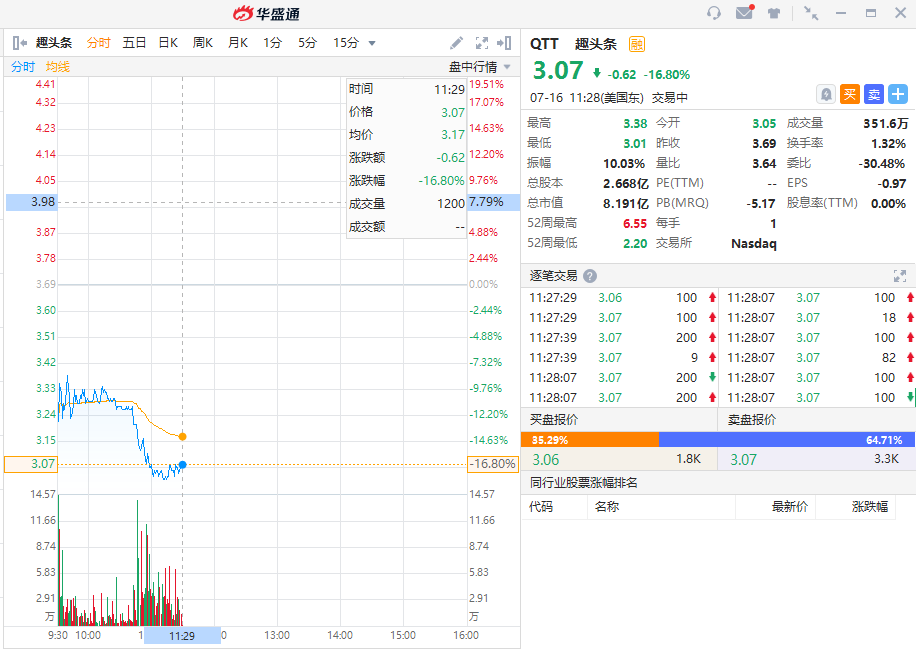 华盛资讯7月16日消息,趣头条大跌16.8%,截至北京时间11:28,趣头条下跌16.8%,报3.07美元每股。