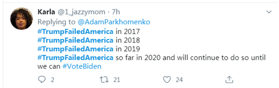 “2017年,特朗普让美国失败;2018年,特朗普让美国失败;2019年,特朗普让美国失败;到现在为止的2020年,特朗普也让美国失败。除非我们能投票支持拜登,不然这种情况还会继续。”