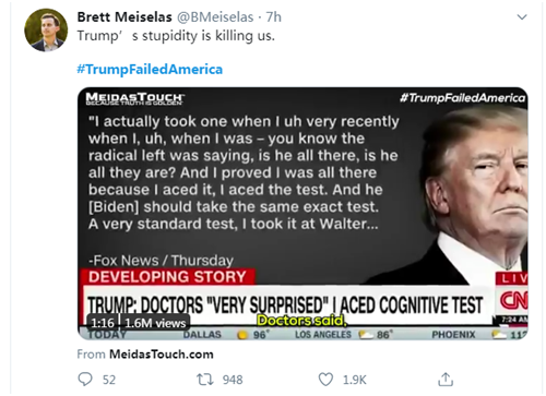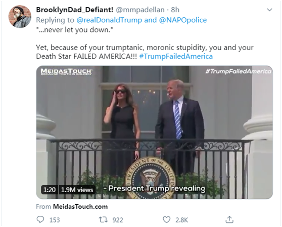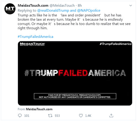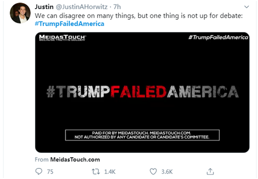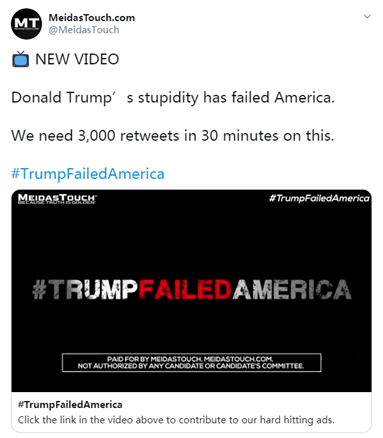 当地时间7月15日晚,一个自称“为了阻止特朗普在2020年总统选举中当选”的反特朗普组织Meidas Touch在推特上发布了一段1分29秒的视频,这段视频主题就是“特朗普让美国失败”。