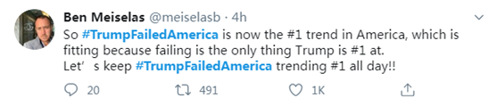 “现在,#特朗普让美国失败 话题已经是美国区热搜榜第一了,很合适,因为失败就是特朗普第一擅长的事。让我们让这个话题全天占据热搜榜榜首吧!!”