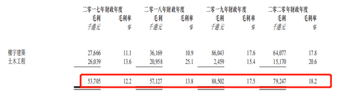 而公司的毛利率则明显处于上升中。报告期内,天任集团的毛利率分别12.2%、13.8%、17.5%和18.2%。虽然18—19年出现3.7%的增长,但土木工程的毛利率大幅下降近10%。而2020年财政年度,公司土木工程项目毛利率大幅增加,从2019年财政年度的15.4%增加至20.6%。