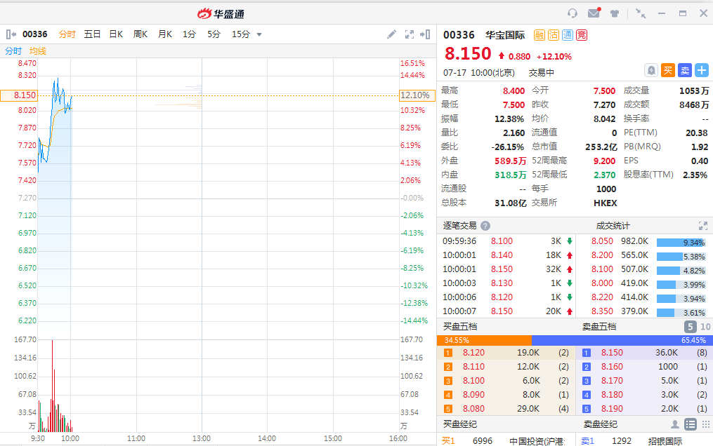 新浪港股讯 7月17日消息,电子烟概念华宝国际大涨逾12%,市值253亿港元,本月暴涨140%,今年涨近2倍。内资疯狂买入,最新持股量3.4亿,占比超11%。