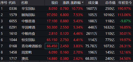 消费股全线走高,华宝国际涨11%,颐海国际涨近8%,中烟香港、华润啤酒等涨超5%,香港中旅、,猫眼娱乐涨超7%,微盟、阿里影业、长城汽车涨6%。