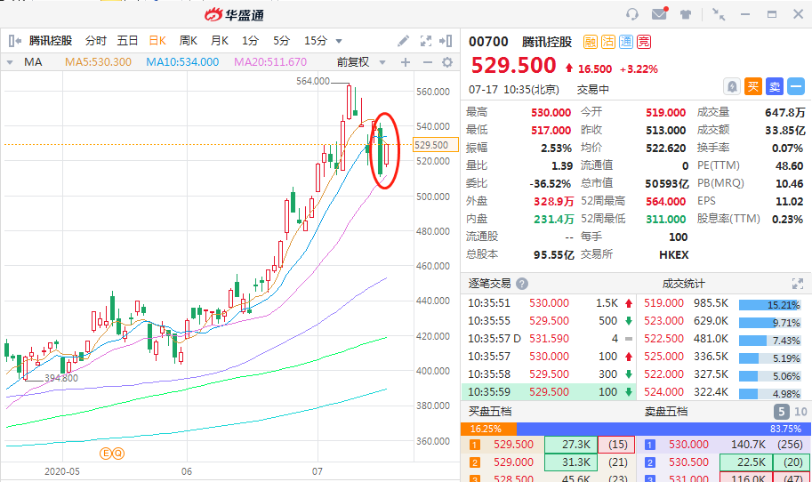 华盛资讯7月17日消息,经过上日急跌,今日腾讯控股、阿里巴巴-SW携手反弹,其中截至北京时间10:35,腾讯大涨3.22%,而其前日曾大跌5.52%。