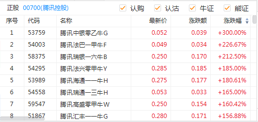 今日,腾讯相关做多轮证纷纷大涨,其中腾讯中银零乙牛G大涨300%领先其他轮证,实现日赚3倍。