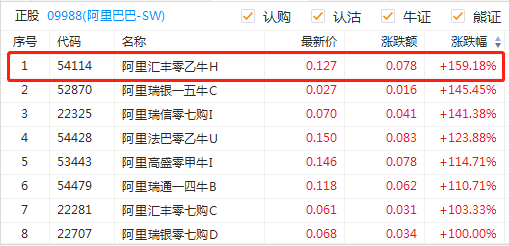 相关轮证中,以阿里汇丰零乙牛H涨幅领先,截至发稿,涨159.18%。