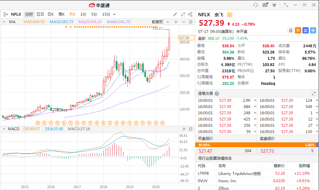 然而第三季度,公司预计新增订阅用户250万,远低于分析师预期的527万。盘后公布业绩报告后,奈飞盘后股价即大跌9.07%至479.58美元。市场对奈飞后继乏力还是颇为失望。