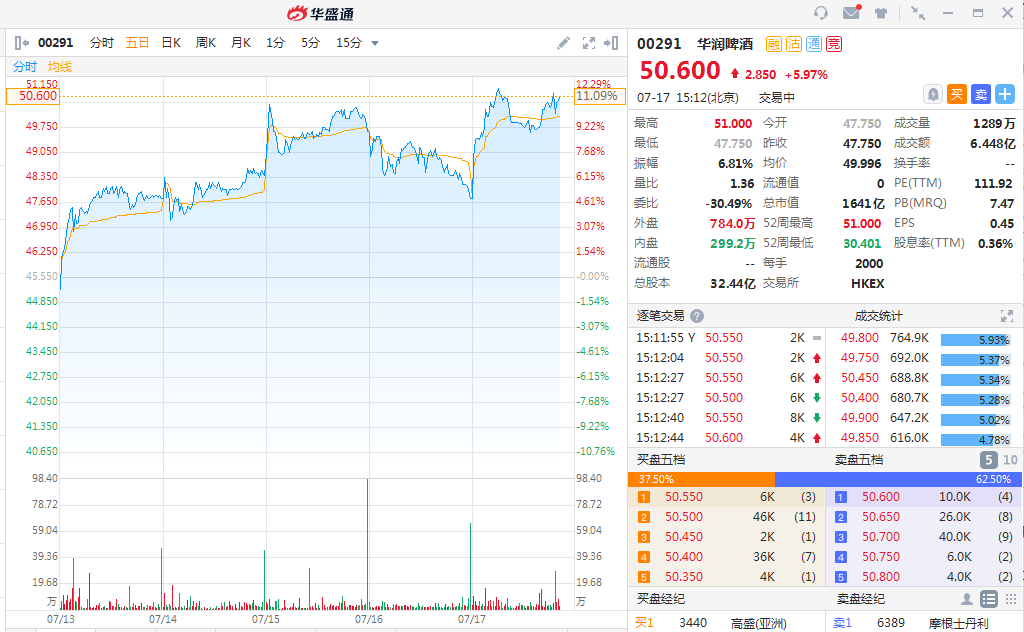 华润啤酒(00291)获美银美林上调目标价12%至55港元,维持“买入”评级。该股盘中以51港元创历史新高,截至15时12分,涨5.97%,报价50.60港元,成交额6.448亿。