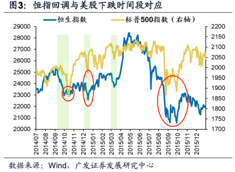 第一个原因与港股“离岸性”有关。从恒指回调与美股下跌时间段对应看,美股每轮下跌,港股都会跟随跳水。例如14年9-10月、14年12月以及15年9月,港股都因为美股的下跌而跟随下跌。