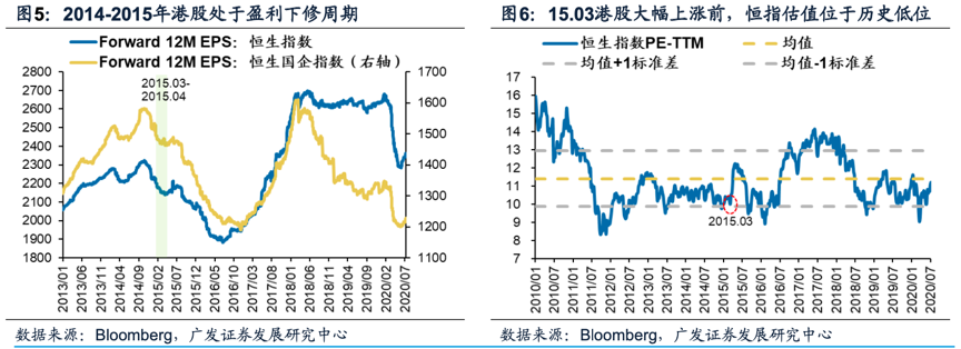 首先,港股彼时的上涨并非基于基本面因素。14-15年,港股处于盈利下修期,即使在港股大幅上行的15年3-4月,市场对恒指的盈利预期也仅是短暂企稳,且随后再次下修。港股的“快牛”行情更多源于估值修复,而其中的主要催化来自南下资金。