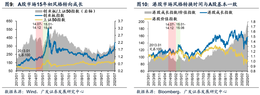 15年1月-15年6月,A股开启全面牛市,期间上证综指最大涨幅60%,以创业板为代表的成长板块表现更为强势,创业板指一度上涨超170%;这一期间港股成长板相较价值板块同样取得显著超额收益。