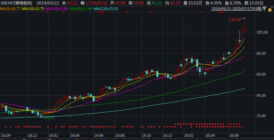 观察泰格医药在A股过往2年的走势,其涨幅非常可观。2019年初,泰格医药的股价低位还只有36元,到2020年7月股价就已经暴涨至最高118.7元,按照前复权区间最大涨幅可达389%!