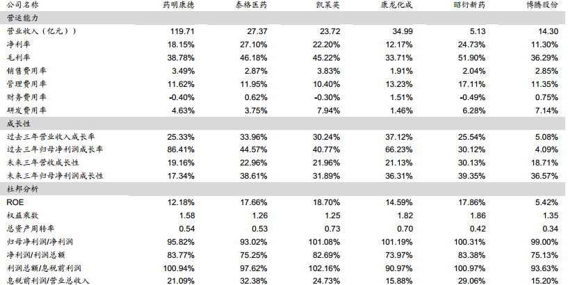 从成长性来看,行业龙头在过去三年均保持了25%~35%的较高复合增速,受益于行业较高的景气度,预计未来三年仍将保持较高增长。从ROE水平来看,CRO/CDMO行业龙头ROE多集中在15~20%之间,药明康德、康龙化成由于新股上市稀释股本,导致ROE略低。