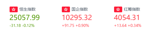 恒生指数开盘跌0.28%,盘初急挫逾300点,回升后全天维持窄幅震荡。截至收盘,恒生指数跌31.18点或0.12%,报25057.99点,全日成交额达1356.18亿。国企指数涨0.9%,报10295.32点,红筹指数涨0.34%,报4054.31点。
