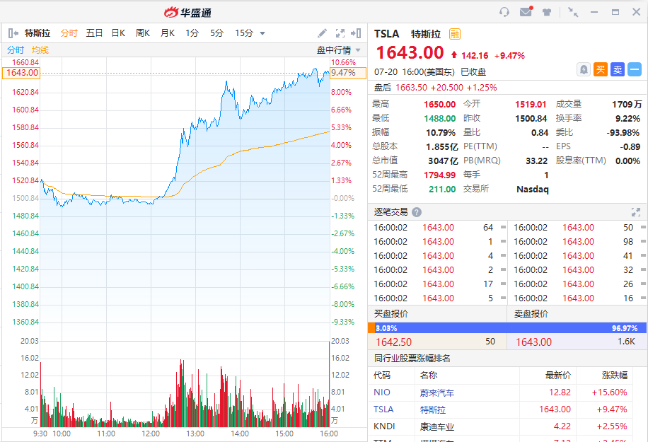 特斯拉(TSLA)大涨9.47%,报1643美元,总市值3046亿美元。据电动汽车行业网站Electrek,特斯拉通知员工称,该公司本季度的目标是创造新的出货量纪录。特斯拉上一次创下季度出货量纪录是在2019年第四季度,当时该公司交付了11.2万辆汽车。特斯拉将于7月22日周三收盘后公布二季度财报数据。