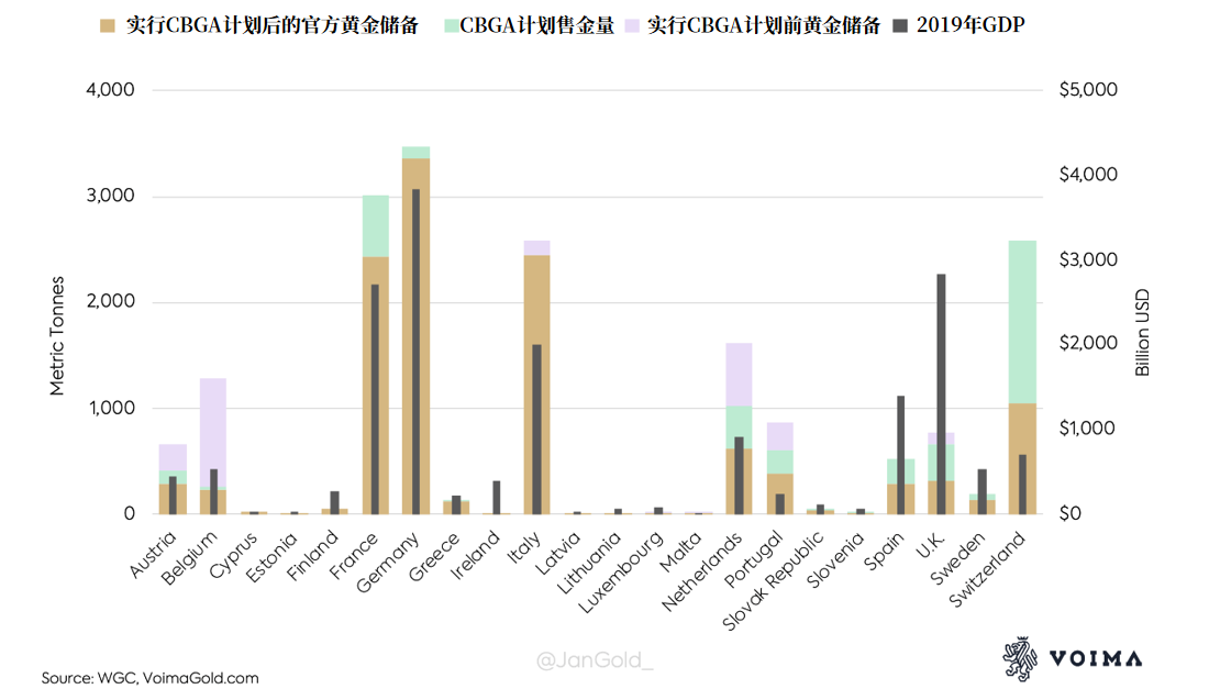 欧盟其他央行也在很长一段时间内采用同样的战略。其中最著名的,当属1999年那震惊世界的5年期黄金销售协同计划——CBGA。该计划由14个欧洲国家的央行联合发布,在正式寿终正寝之前曾三次延长,2009年之前共售出超4000吨黄金。