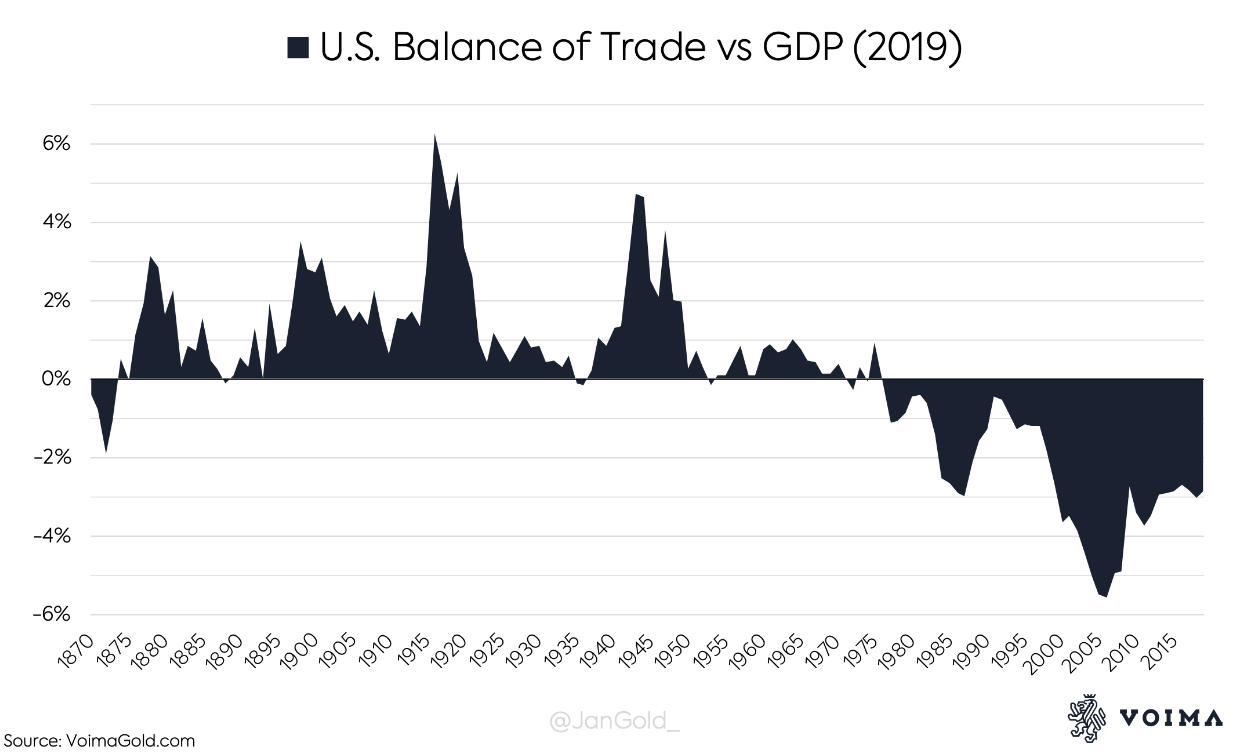 世事永远是有得必有失。上世纪80年代,通过出售大约500吨黄金,美国成功提升了美元的实际地位。借着IMF推出特别提款权(SDR)这个机会,美元攻占离岸市场,和美债一起成为主要国际储备资产。但自此之后,美国就一直处于贸易和财政双赤字状态。