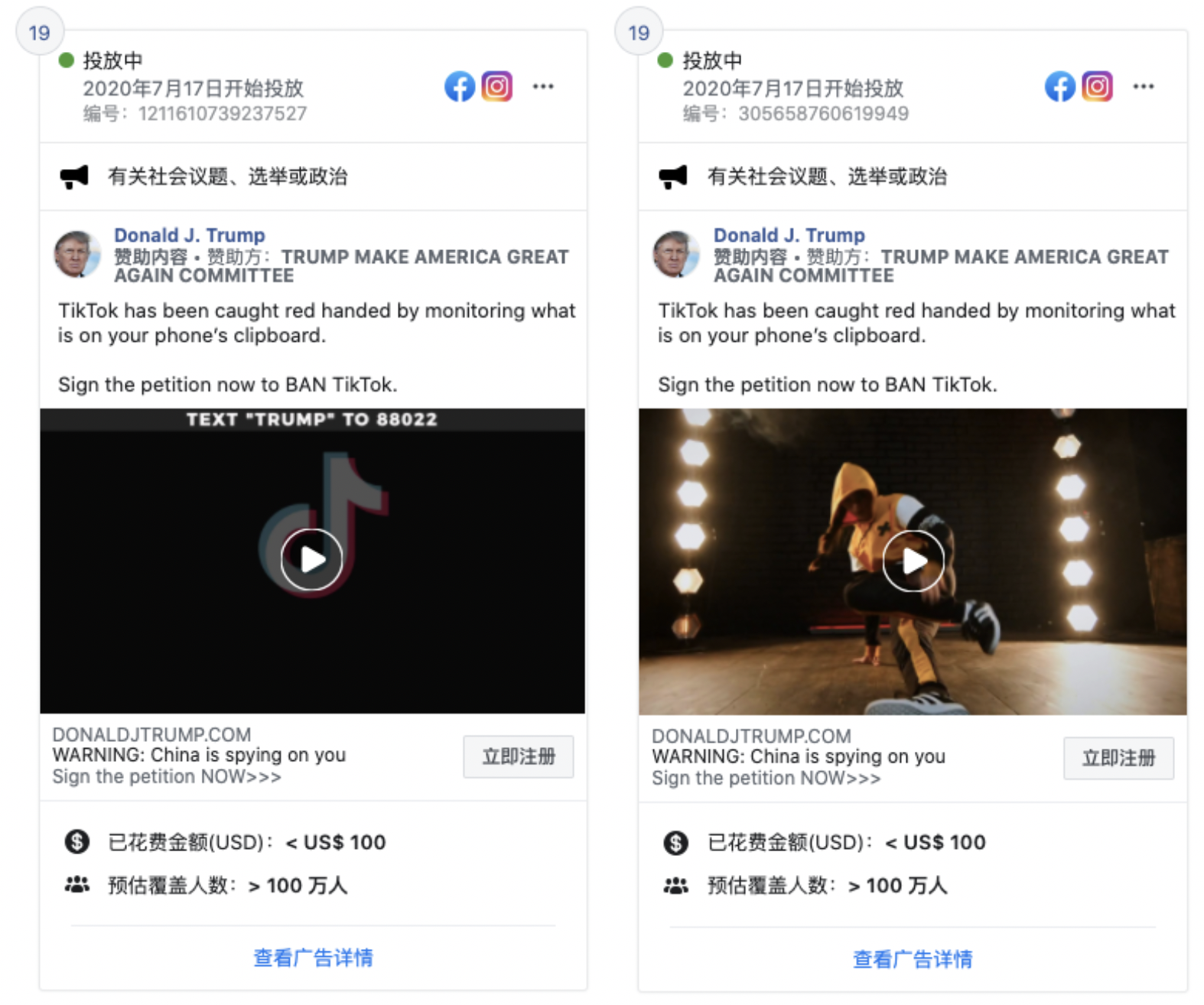 7月17日,美国总统唐纳德·特朗普的Facebook和Instagram账号投放了数则政治广告,警告美国用户称“TikTok正在监视你的隐私”,并号召其签署封禁TikTok的请愿书。这些广告会跳转到一项调查内容,询问用户是否认为特朗普应该在美国禁止TikTok,并促使参与者向特朗普竞选活动捐款。