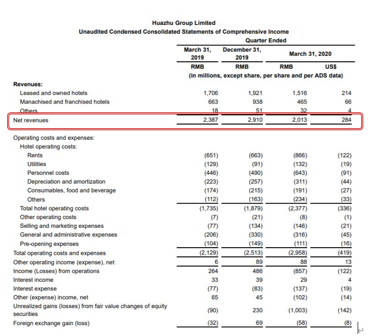 华住一季度净收入20.13亿元人民币,同比下降15.7%,环比下降30.8%。