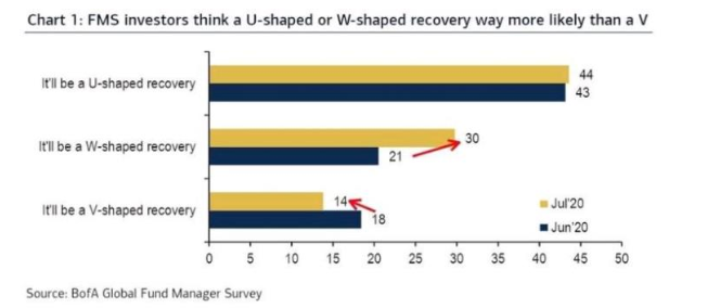 根据美银美林公布的7月全球基金经理调查,科技股依然是资金最青睐的目标,74%的基金经理人认为,做多科技股和成长股的交易过于拥挤,该比例创下了新高。相比之下,基金经理对经济复苏的力度及其持续时间依然较为谨慎。只有14%的受访者认为经济复苏将是V形的,较上期调查回落4个百分点。认为W形和U形复苏的比例分别为30%和41%。新一轮疫情被认为是目前市场面临的最大风险,持此观点的基金经理比例高达52%。