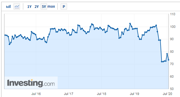 危险信号开始出现,最新公布的密歇根大学7月消费者信心指数从上月的78.1下滑至73.2,同时反映未来6个月经济前景的预期指数也环比下滑6.1个百分点至66.2。密歇根大学消费调查主管科尔丁(Richard Curtin)表示,消费者需要一些时间重新评估疫情可能对个人财务和整体经济造成的影响。令人担心的是,随着病毒的传播,未来造成持续经济危害的可能性正在变大,如果消费者信心像今年3月、4月那样再次大幅下滑,经济衰退将持续更长时间。