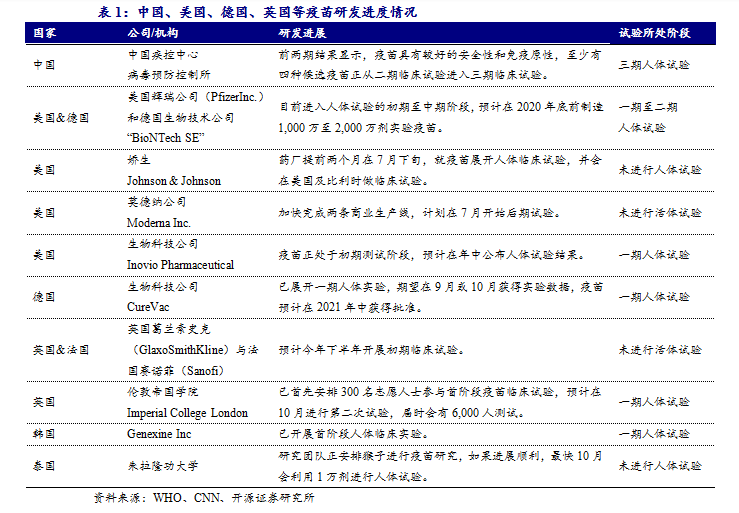 在此次疫情对经济行为的干扰结束前,美国经济的修复节奏或将难以加速。随着美国各州因政治利益不同等在疫情防控上各自为政,以及当前社会体制下疫情防控思维难以建立,美国疫情反复或将成为常态。对于美国经济而言,在新冠病毒疫苗上市前,疫情可能将持续拖累私人部门资产负债表修复进程,导致经济修复节奏难以加速。从新冠病毒疫苗的最新研发进展来看,中国暂时领跑,美国、德国、英国等有序推进。世界卫生组织(WHO)7月3日表示,一切进展顺利的情况下,新冠疫苗“最快”可能在2020年年底上市。
