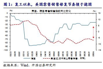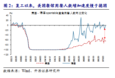 全球范围来看,美国经济的修复节奏,远不及复工时间相近的德国。德国自4月20日起开始复工,复工时间与美国相近。但从复工后的经济修复节奏来看,德国远快于美国。例如,4月下旬以来,德国零售销售同比增速由-72%大幅改善至-25%,而同期美国零售销售(红皮书商业零售销售)同比增速仅从-8.1%反弹至-6.9%。餐饮消费方面,近2个月来,德国餐馆堂食用餐人数同比增速由-100%抬升至-1%,而美国用餐人数增速仅从-100%修复至-65%左右。