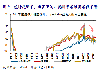 受疫情影响,美国私人部门资产负债表修复进程开始放缓,压制企业及居民经济行为。疫情爆发后,美国出现破产潮及失业潮,企业及居民资产负债表受损严重。虽然在大规模财政刺激、货币宽松政策及随后开启的复工计划支持下,美国企业及居民资产负债表有所修复,但修复进程持续受疫情干扰。以居民部门为例,持续领取失业金人数的下滑速度一直较为缓慢,6月以来伴随疫情反弹,更是出现抬升。这一背景下,美国居民的经济行为持续受到压制。数据来看,6月以来,美国消费者信心指数继续低企,线下餐饮消费增速等更是由涨转跌。