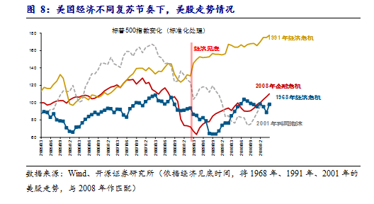 企业盈利止跌反弹带动下,美国经济往往走出衰退,但随后的复苏节奏一般不尽相同。对比1968年、2001年、1991年、2008年的美国经济走势,不难发现,美国经济在2008年和1991年走出衰退后的复苏节奏,明显快于2001年和1968年。不同的经济复苏节奏下,美国资本市场表现存在显著差异。以美股为例,伴随着经济快速修复,美股在2008年和1999年自低点反弹的速度,远快于2001年和1968年。