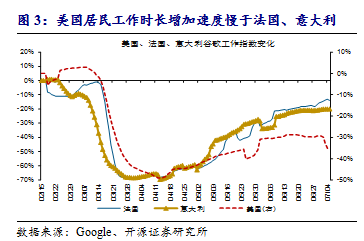 美国经济的修复节奏,甚至慢于复工开启时间相对更晚的意大利、法国等。意大利、法国开启复工的时间分别为5月4日、5月11日,晚于美国。但从经济修复节奏来看,意大利、法国均快于美国。以谷歌指数为例,复工至今,意大利、法国谷歌工作指数分别提升了22、47个百分点,超过美国的9个百分点;意大利、法国谷歌交通指数分别提升33、85个百分点,超过美国的22个百分点。谷歌居家指数上,意大利、法国分别下降了16、23个百分点,也超过了美国的9个百分点。
