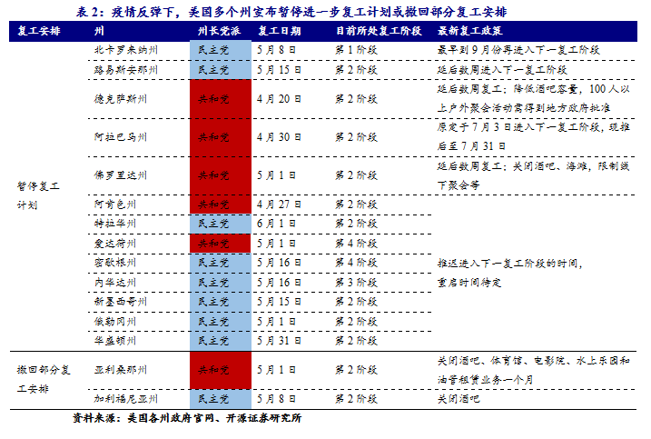 极端情况下,若疫情形势持续大幅恶化、引发美国政府推出第二轮防疫封锁措施,不排除美国经济二次探底风险。6月下旬以来,随着疫情大幅反弹,德克萨斯州、佛罗里达州、密歇根州、华盛顿州等纷纷宣布暂停进一步复工计划。加州、亚利桑那州等,虽未暂停复工,但也撤回了部分复工安排,包括重新关闭酒吧、限制室内公共活动等。对于美国经济而言,极端的风险主要来自疫情形势持续大幅恶化,引发政府实施第二轮防疫封锁措施。一旦发生,美国私人部门资产负债表可能将再次严重受损,拖累经济二次探底。