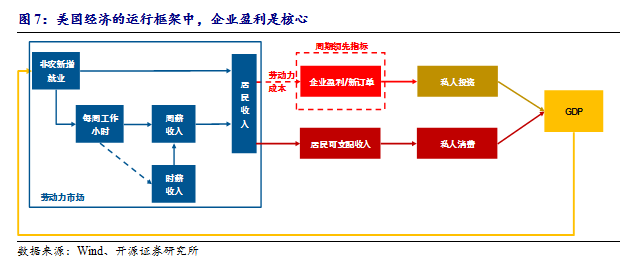 美国经济周期中,企业盈利是最核心的驱动力,领先私人投资、消费及GDP等变化。虽然美国GDP中私人消费占比接近70%,但企业盈利才是驱动美国经济的最核心动力。从美国经济的运行逻辑来看,私人投资和私人消费共同主导GDP走势。其中,私人投资直接由企业盈利决定,私人消费主要受劳动力市场影响(通过收入影响消费),而后者景气变化与企业盈利走势密切相关。