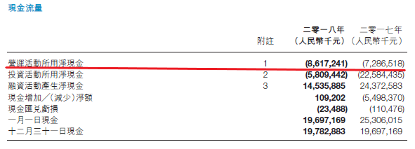 2019年财报显示,当年度公司经营活动现金流净流出241.45亿元。这不仅是公司连续第三年现金净流出,且流出额度也由上一年的86.17亿元大幅攀升180.2%。