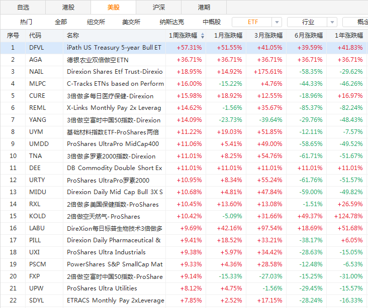 而上周涨幅榜中排名最高的ETF/ETN为DFVL,一周大涨57.31%,这只ETF全称为iPath US Treasury 5-Year Bull ETN,旨在为投资者提供巴克莱(Barclays5Y)美国国债期货目标敞口指数的敞口。