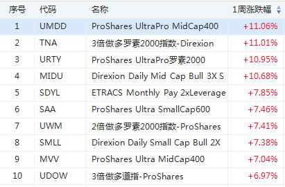 上周美股中,中小型股开始跑赢大盘股,各股指ETF中,表现最好的是3倍做多标普中型股400指数的UMDD,一周累计涨幅为11.06%,而罗素2000指数相关ETF则紧随其后。