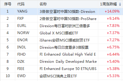 而相比此前区域类ETF涨幅榜被中国相关ETF“垄断”,上周的涨幅榜就比较多元化了,其中欧洲、印度市场的做多ETF都表现不错。