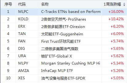 其中,天然气在连续2周大涨后回落,2倍做空天然气的KOLD上周涨10.42%,在所有仍可交易的ETF中按涨幅排名第13。