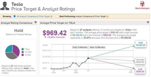 去年,有34位华尔街分析师发布了特斯拉的“买入”,“持有”和“卖出”评级。目前该股票有11个卖出评级,14个持有评级和9个买入评级,因此共识建议为“持有”。