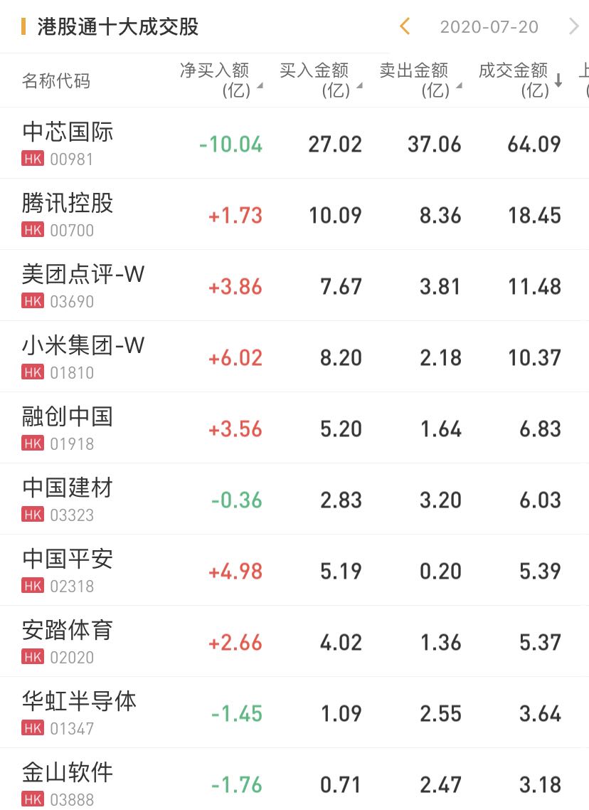 个股方面,港股通今日净买入小米6.02亿港元,中国平安4.98亿港元,美团点评3.86亿港元;净卖出中芯国际10.04亿港元(近四日净卖出42.24亿港元),金山软件1.76亿港元。