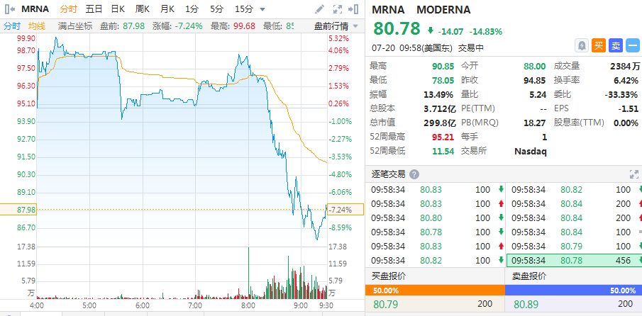 华盛资讯7月20日消息,美国药企Moderna早盘熔断,复牌后继续大跌15%,与此同时辉瑞、BioNTech股价双双上涨,BioNTech现涨近6%,辉瑞涨近2%。