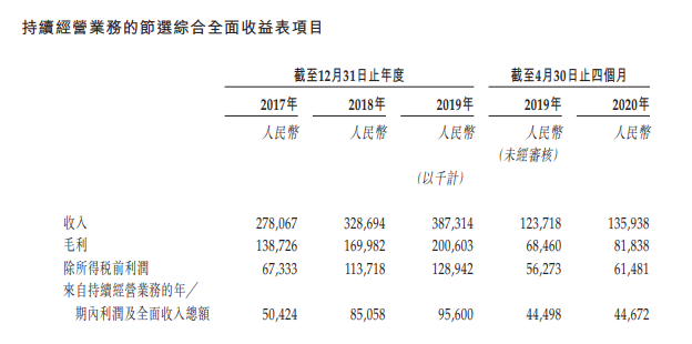 招股书显示,截至2017年、2018年及2019年12月31日止年度以及截至2019年及2020年4月30日止四个月,持续经营业务的收入分别为人民币2.781亿元、人民币3.287亿元、人民币3.873亿元、人民币1.237亿元及人民币1.359亿元,持续经营业务的年内利润及全面收入总额则分别为人民币5042万元、人民币8506万元、人民币9560万元、人民币4450万元及人民币4467万元。