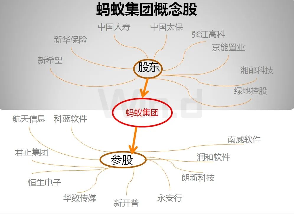 如果蚂蚁集团成功上市,直接或间接持有蚂蚁集团股份的、与其有业务合作的上市公司或将受益。A股市场上有不少蚂蚁集团概念股,以下为部分名单: