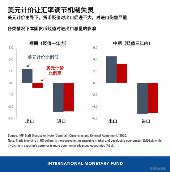 IMF发现越来越多新兴市场国家的企业,进出口计价依赖美元,举债也依赖美元。这种“美元主导”一切的格局,伤害了国际贸易通过汇率升贬自我调节的机制。全球贸易过度依赖美元也将继续推高强势美元,反而引起全球贸易进一步萎缩。