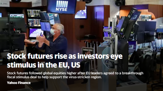 欧盟领导人终于就疫情后欧盟经济复苏一揽子措施达成协议;且消息称美国正制定另一个万亿刺激计划,美国国会两党本周将对新一轮立法方案展开正式谈判,以应对新冠肺炎疫情的冲击。