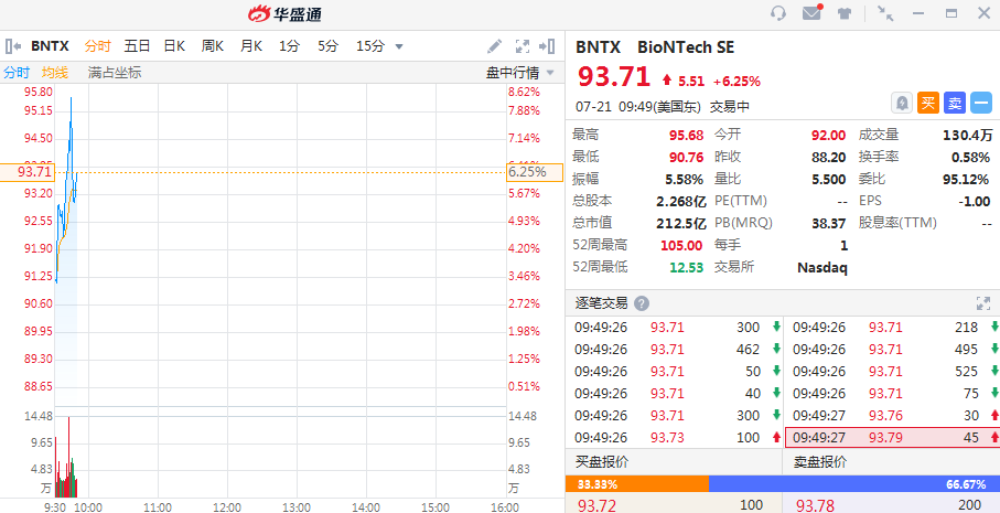21日美股盘初,疫苗股Biontech Se (NASDAQ:BNTX)大涨6.25%,报93.71美元。
